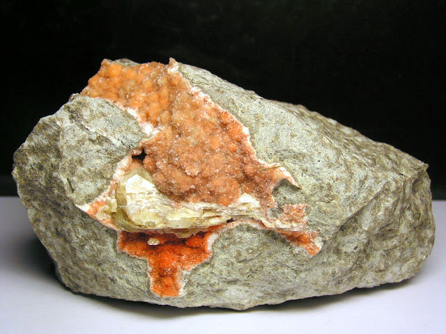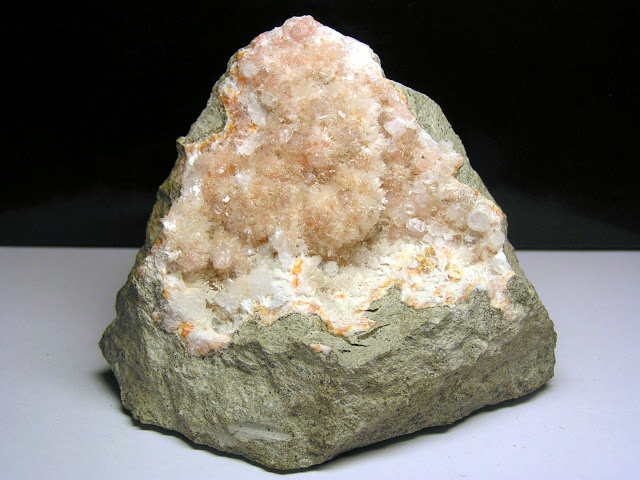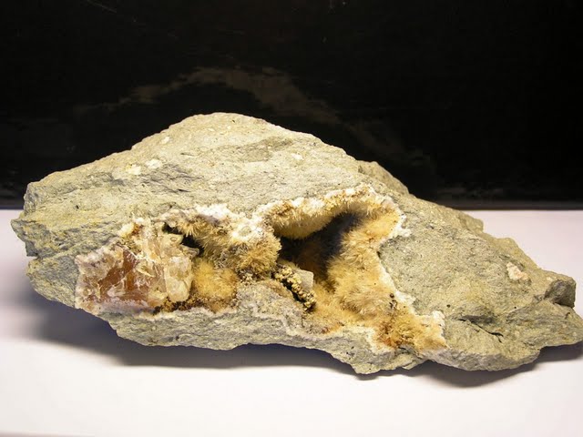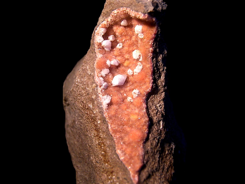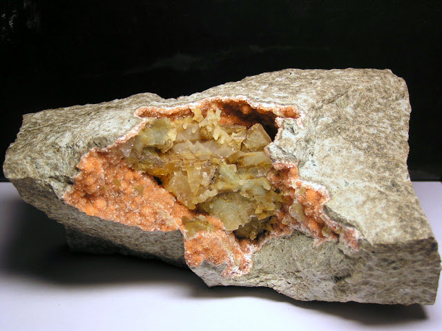 - Pěkný vzorek s dutinou červenorůžového natrolitu a se zajímavými nárůsty kalcitu (Mariánská skála). Velikost vzorku 159 mm.