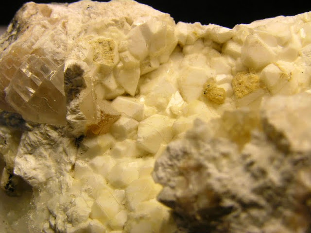 - fluorit Detail dutiny fluorapofylitu – na levé straně nažloutlá 4 mm krychlička fluoritu.