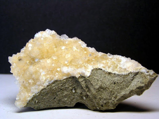 - Klasický vzorek natrolitu s kalcitem z 1. etáže (Mariánská skála). Velikost vzorku 149 mm.