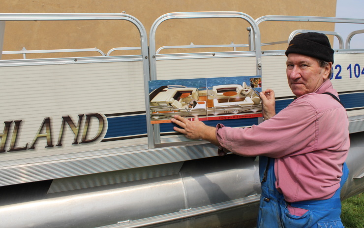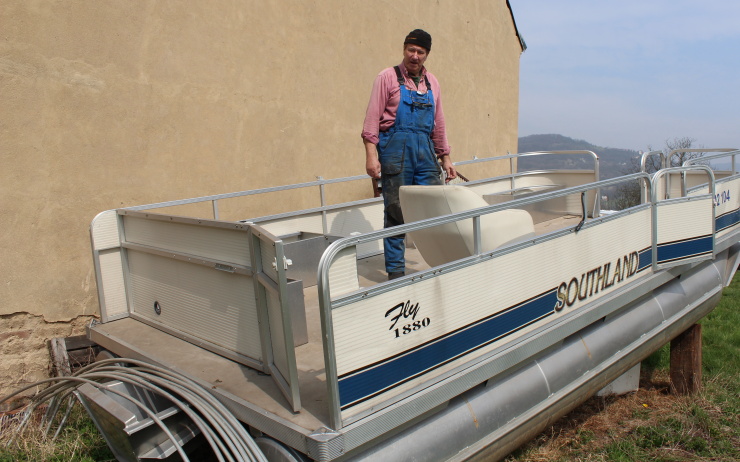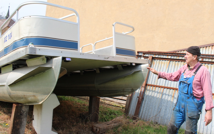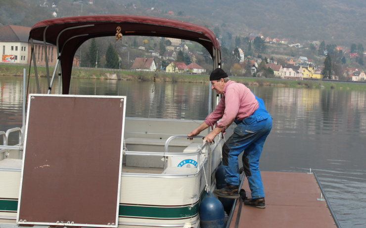 Josef Třešňák ukazuje kanadský katamarán, který bude sloužit jako přívoz mezi Svádovem a Neštěmicemi. Foto: Petr Sochůrek